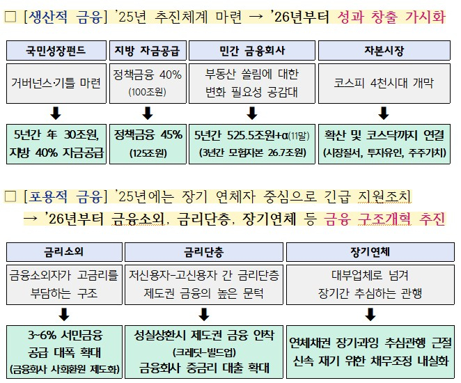 150조원 규모 국민성장펀드의 1차 메가프로젝트 후보군으로 AI(인공지능), 반도체, 이차전지 등 7건이 선정됐다. 청년, 취약계층, 채무조정이행자 등 금융소외자에게 연 3~6%의 낮은 금리로 정책서민대출이 공급된다.
