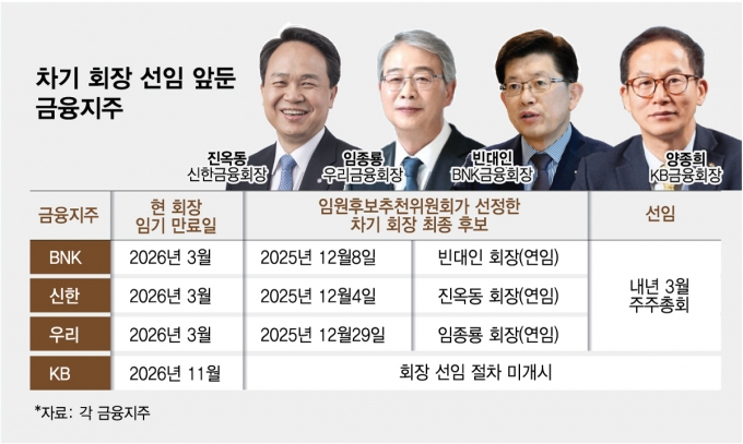 주주의 통제권 강화는 금융지주회사법 개정이 필요한 만큼 오는 11월 양종희 현 회장의 임기가 만료되는 KB금융지주가 첫 적용 사례가 될 수있다. 빈대인 BNK금융지주 회장, 진옥동 신한금융지주 회장, 임종룡 우리금융지주 회장은 지난해 12월 이사회의 단독 후보 추천으로 오는 3월 주총 의결을 앞두고 있다.