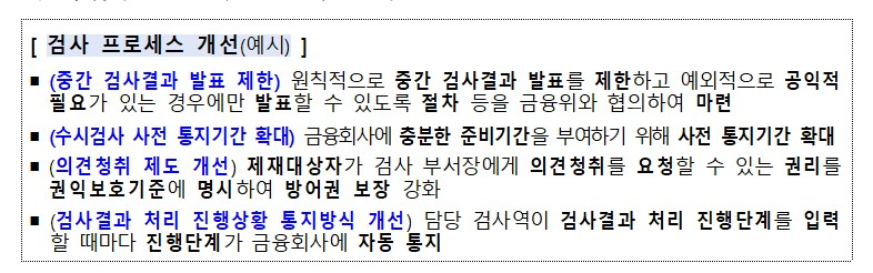 검사 프로세스의 혁신을 위해 그동안 수시로 했던 중간검사 결과 발표는 원칙적으로 제한한다. 금융위원회와 사전 협의해 예외적으로 공익적 필요가 있는 경우에만 절차를 마련해 발표하기로 했다. 이복현 전 원장 시절 금감원은 검사 및 제재가 완료되지 않은 경우라도 공익적인 차원에서 필요시 검사 내용을 중간에 외부에 알렸다. 지난 2024년 총선기간 양문석 당시 더불어민주당 국회의원 후보의 새마을금고 편법대출 의혹, 2025년 우리금융 전 회장의 친인척 부당대출, 같은해 4월 IBK기업은행 전현직 직원의 부당대출 등에 대한 검사가 대표적이다.