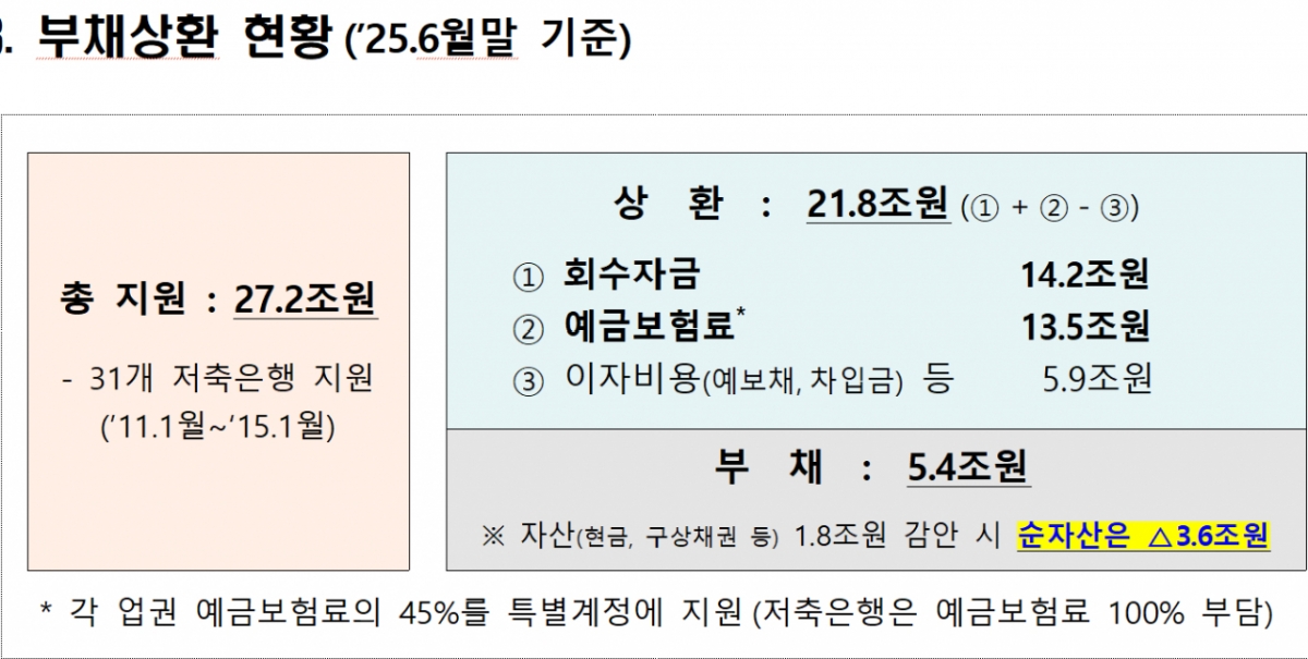 처음 예상 대비 지원 규모가 크게 늘었지만 회수 노력과 예금보험료 지원 등으로 이미 상당 부분을 상환했다. 운영 기한 1년 연장만으로도 특별계정의 잔여 부채를 충분히 해소할 수 있을 것으로 전망된다.