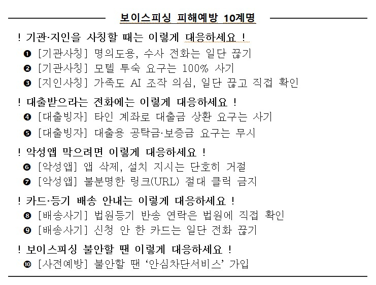 금융당국 관계자는 "보이스피싱 범죄는 검찰, 수사기관 등을 사칭해 심적인 압박감을 주거나 자녀·친인척 음성을 AI 변조해 급박한 상황을 연출하는 등 피해자의 심리적 불안을 조장하면서, 정상적 판단이 흐려지는 것을 노리는 경우가 많다"며 "최근 횡행하는 범죄수법을 숙지하고 침착하게 대응하면 상당수의 피해를 방지할 수 있다"고 강조했다.