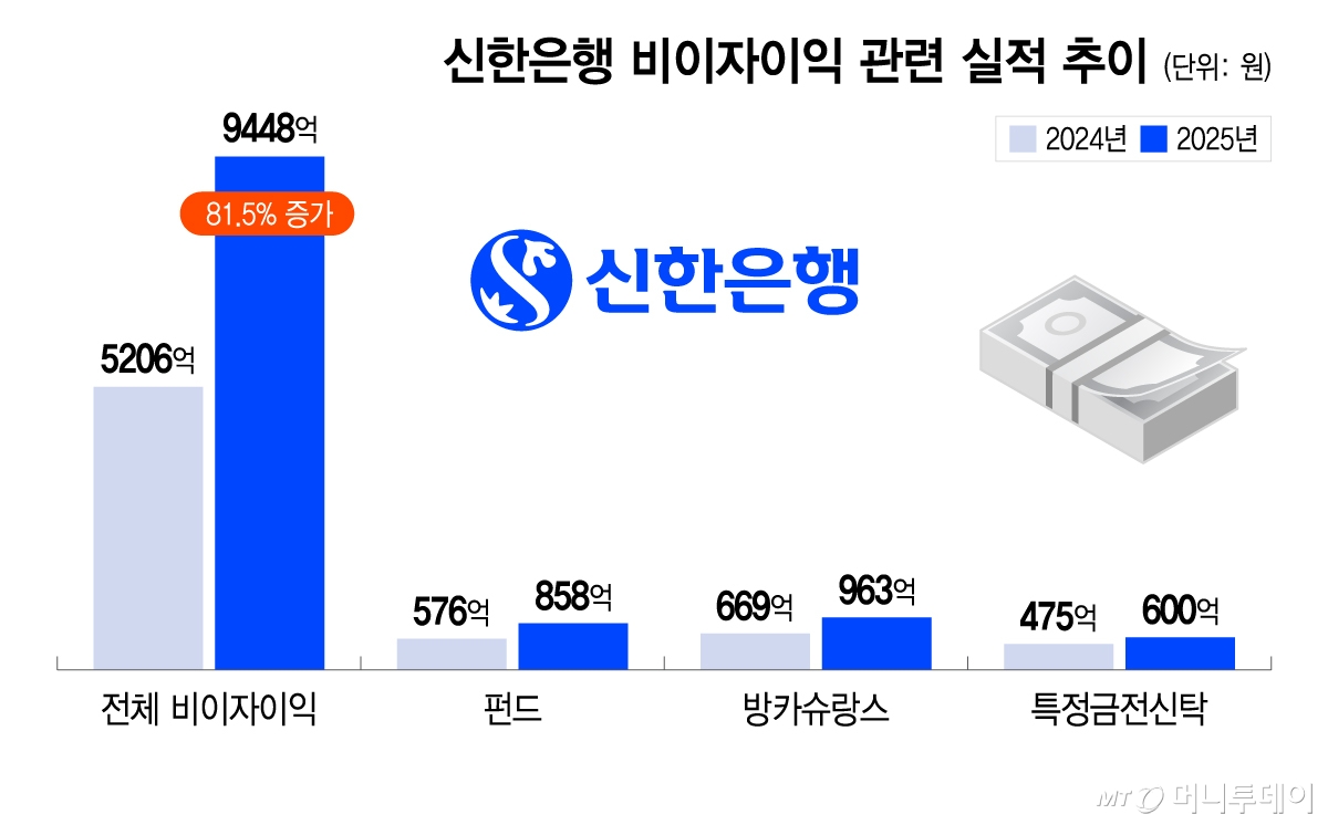 그 결과 2024년말 17조1124억원이던 펀드잔액은 2025년말 22조9767억원으로 5조8643억원(34.3%) 증가했다. 2026년 1월말 기준 펀드 잔액은 23조2738억원으로 성장세가 이어지고 있다. 이에 펀드 손익(판매수수료 이익)도 2024년 576억원에서 지난해 858억원으로 48.9% 급증하며 비이자이익 성장을 견인했다. 이밖에 방카슈랑스는 전년 대비 294억원 증가한 963억원, 특정금전신탁은 전년 대비 125억원 증가한 600억원으로 각각 집계됐다.