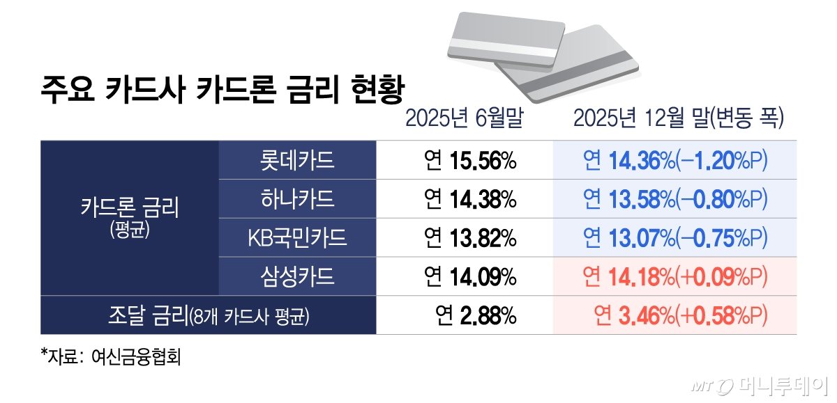 카드사 조달금리 상승에도 카드론 금리는 오히려 낮아진다. 지난 반년간 카드사의 평균 조달금리는 연 0.6%포인트(P)가량 올랐지만 카드론 금리는 최대 연 1.2%P 내렸다. 카드사들이 카드론 영업을 확대함과 동시에 포용금융을 강조하는 정부 기조에 호응하는 것으로 분석된다.