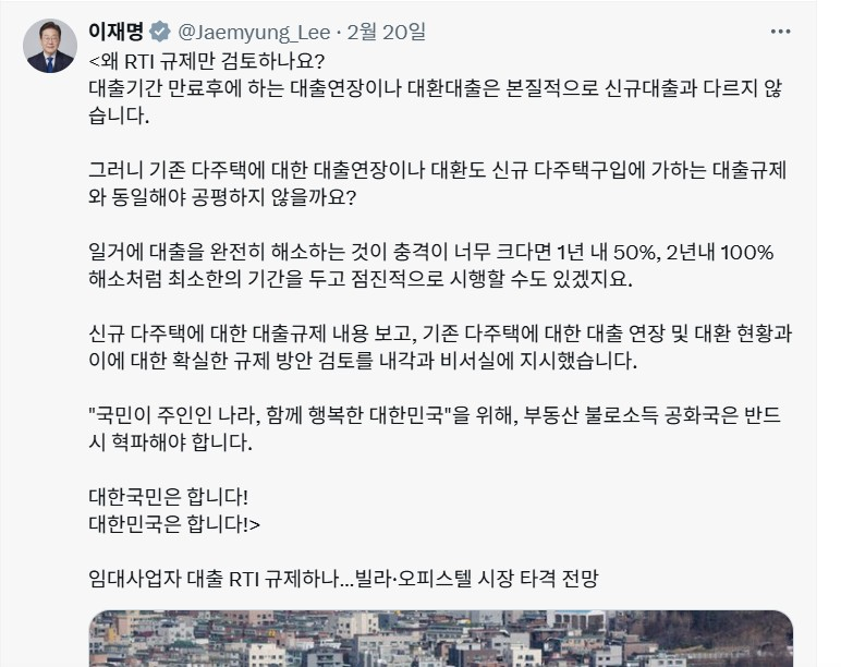 그런 와중에 이 대통령이 지난 20일 X에서 추가로 "왜 RTI 규제만 검토하나, 대출 기간 만료 후에 하는 대출 연장이나 대환대출은 본질적으로 신규 대출과 다르지 않다"고 지적했다. 또 "일거에 대출을 완전히 해소하는 것이 충격이 너무 크다면 1년 내 50%, 2년 내 100% 해소처럼 최소한의 기간을 두고 점진적으로 시행할 수도 있을 것"이라며 강도 높은 규제를 주문했다.