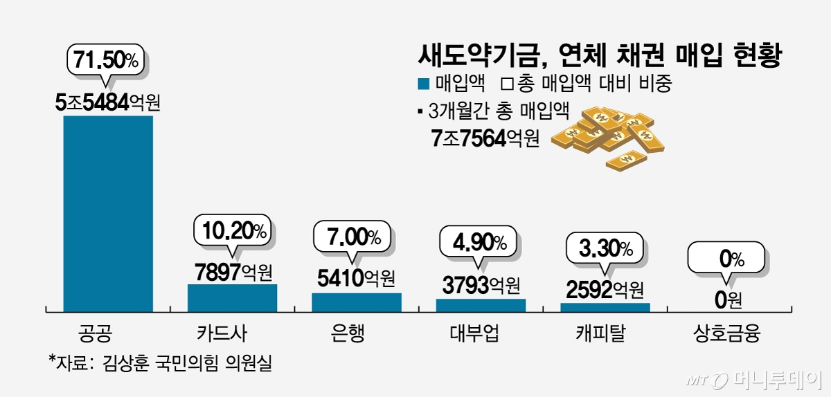 김상훈 국민의힘 의원실에 따르면, 한국자산관리공사(캠코)가 지난해 10월부터 3개월간 매입한 장기 연체채권 규모는 약 7조7564억원이다. 이 중에서 대부업 보유 채권은 3793억원에 불과하다. 약 5% 수준이다.