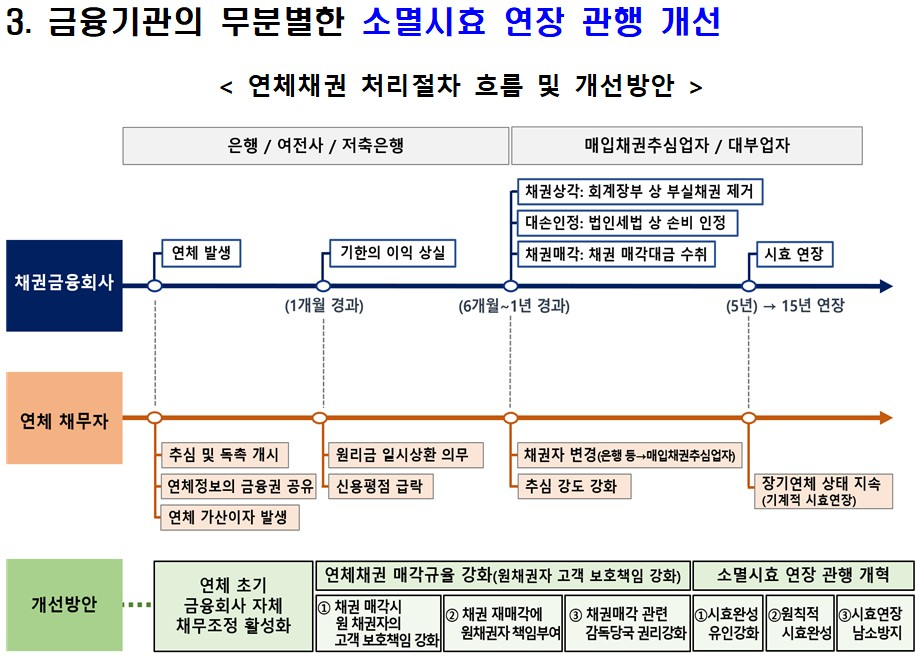 이번 방안에 따라 무분별하게 소멸시효를 연장하는 관행에 제동이 걸린다. 연체채권의 소멸시효(5년)가 도래하면 금융회사는 법원의 지급명령(독촉절차)이나 채무승인 등을 통해 시효를 연장해 왔다. 금융회사가 신청하면 법원이 지급명령을 내리고, 해당 사실을 채무자에 알려야 한다. 14일 이내에 채무자가 이의신청을 하지 않으면 소멸시효가 최대 10년 연장되는 수준이다.
