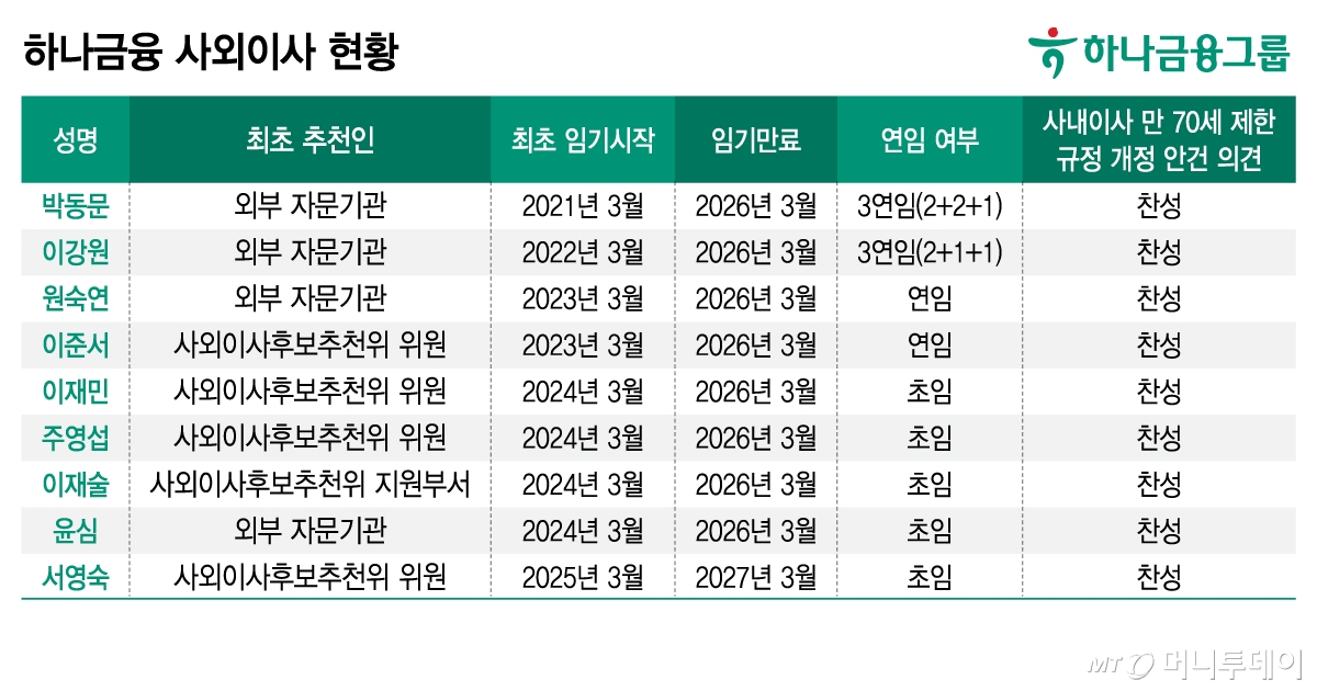 현재 하나금융의 사외이사는 총 9명으로 이중 지난해 임명된 서영숙 사외이사를 제외한 8명이 오는 3월 임기가 만료된다. 재추천을 받은 7명의 사외이사는 1년 더 임기를 이어가고, 최현자 사외이사는 2년 임기를 부여받을 것으로 보인다.