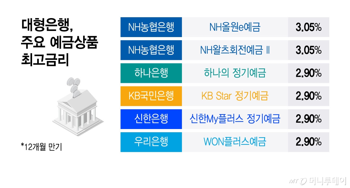 3일 금융권에 따르면 NH농협은행은 이날 대표 정기예금 상품인 NH올원e예금과 NH왈츠회전예금 II의 1년 만기 최고금리를 3.05%로 15BP(1BP=0.01%P) 인상했다.
