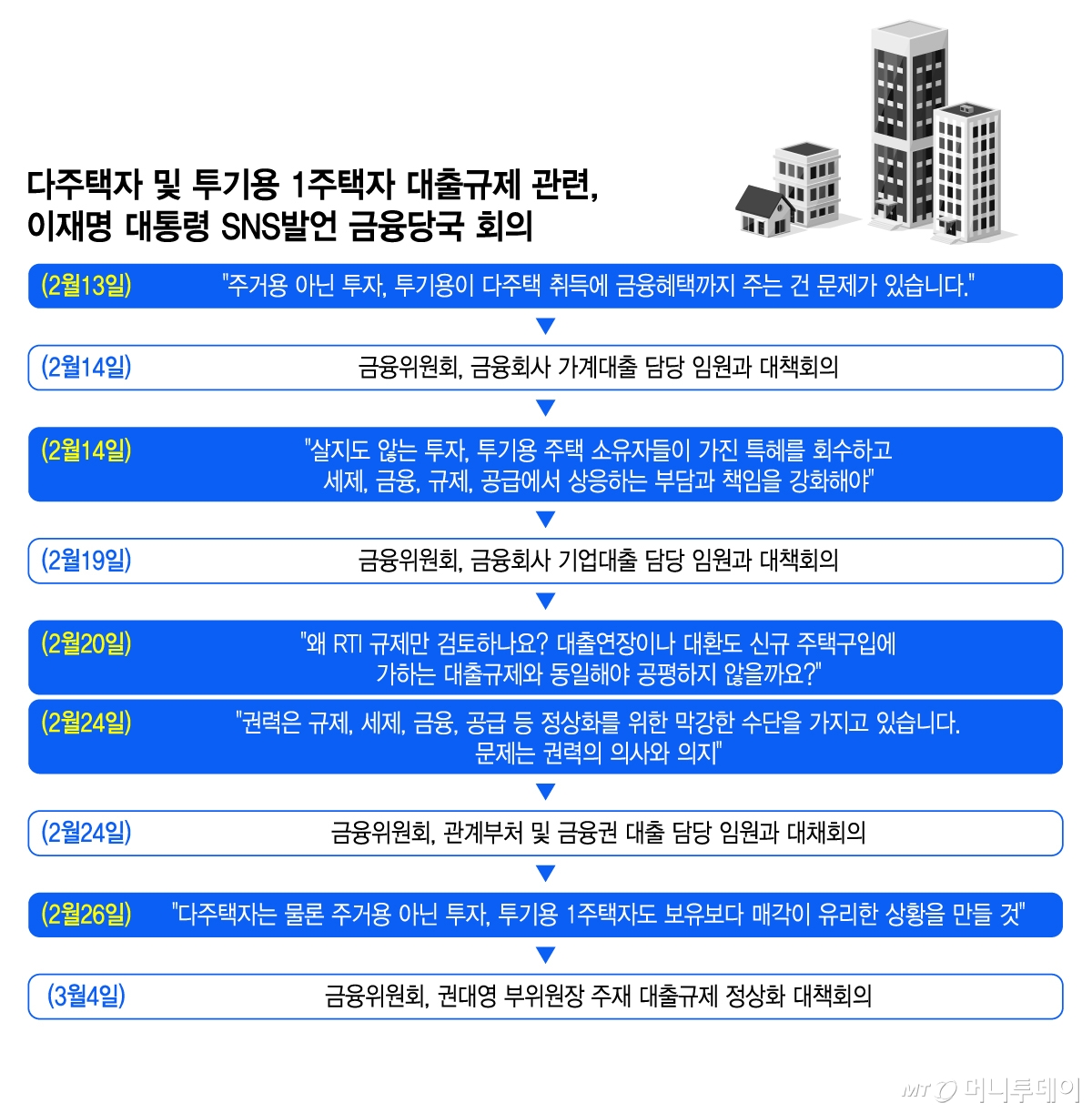이 대통령이 "투기용 다주택자에 금융혜택을 주는 건 문제가 있다"(2월13일)고 지적하자 해당 대출이 정확히 어떤 대출을 말하는지부터 초기 혼선이 빚어졌다. 다주택자 대출은 지난해 6·27 대책에서 이미 금지됐기 때문이다. 금융당국은 지난달 14일 곧바로 은행과 상호금융 가계대출 담당 임원을 소집해 주로 주거용 임대사업자 대출로 대상을 좁혀 규제 방안을 논의했다. 만기 일시상환 대출이면서 대출 만기가 3~5년으로 짧은 임대사업자 대출이 이 대통령의 발언 취지에 부합하는 대출이었기 때문이다.