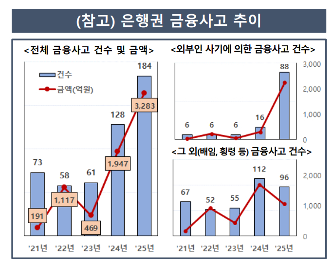 금감원은 지배구조 개선 필요성의 배경으로 은행권 금융사고 증가와 소비자 피해 우려 등을 꼽았다. 은행권 금융사고 발생 건수는 2023년 61건에서 2024년 128건, 2025년 184건으로 증가하는 추세다. 같은 기간 사고 금액도 469억원, 1947억원, 3283억원으로 늘어나고 있다.