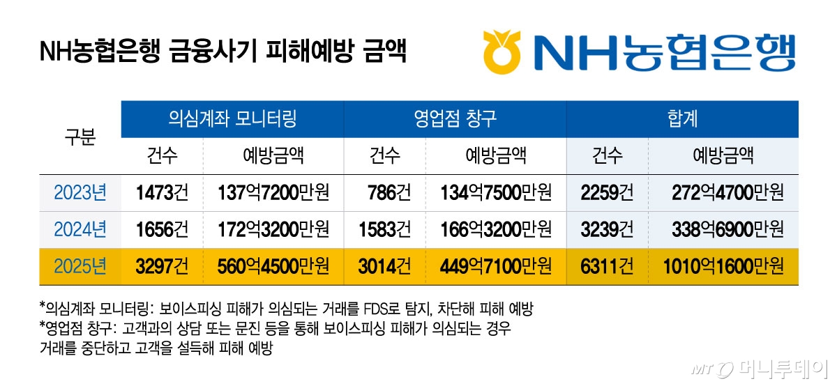 농협은행의 소비자보호 성과는 보이스피싱 등 금융사기 피해 예방에서 두드러졌다. 지난해 금융사기 피해 예방금액은 1010억원으로, 전년(339억원) 대비 3배에 달했다. 고객의 총 보유자산이 아닌 피해와 직접 연관된 금액만 계상한 것으로, 실질적 피해 예방 규모는 집계된 금액 이상이라는 분석이다.