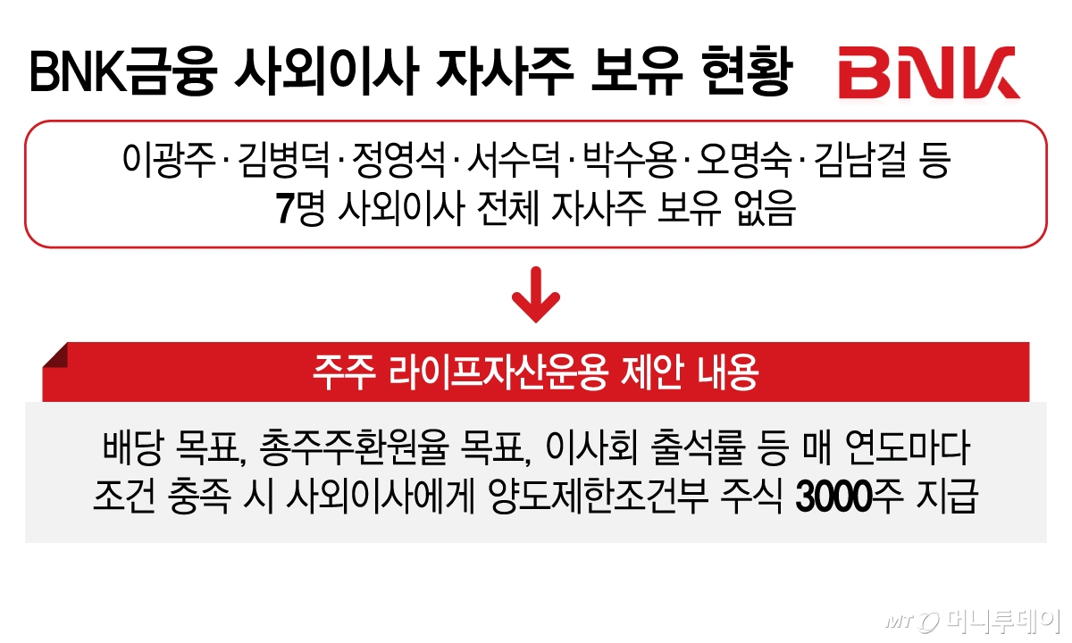 라이프운용은 7개 조건을 충족하는 사외이사에게 매년 이사회 승인을 거쳐 BNK금융 주식 3000주를 부여하자고 제안했다. 구체적인 조건은 △전년 대비 배당금 10% 이상 증액 및 배당소득분리과세 요건 충족 △총주주환원율 47% 이상 △결산 기말 기준 보통주자본비율(CET1) 12.5% 이상 △경영승계 프로그램의 시스템화 △연 1회 이상 사외이사 과반이 주주에게 이사회 주요결정 사항 설명 △주주추천 사외이사 전원이 임원후보추천위원회 위원으로 참여 △이사회 출석률 90% 등이다.