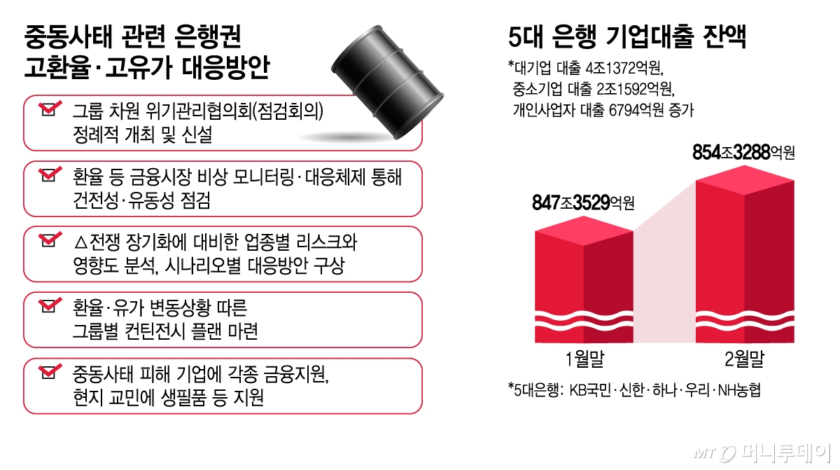 은행권은 중동사태가 장기화될 가능성에 대비해 비상대응 체계를 가동하고 있다. 유가와 환율 변동성을 실시간으로 모니터링 하고 업종, 산업별 파급 영향을 파악하는 것이다.