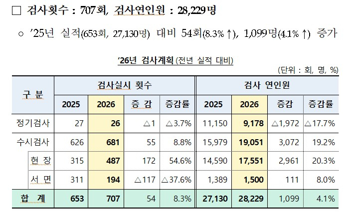 정기검사는 전년 대비 1회 줄어든 26회 실시한다. 업권별로 지주를 포함한 은행은 6회, 중소금융 9회, 금융투자 3회, 보험 7회, 디지털·IT(전자금융) 1회 등이다. 수시검사는 전년 대비 55회 늘어난 681회 할 예정이다. 은행(지주 포함) 79회, 중소금융 99회, 금융투자 146회, 보험 122회 등으로 현장 검사 487회 서면검사 194회 각각 실시한다.