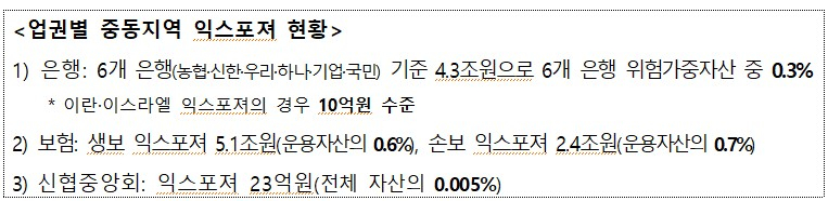 생명보험사와 손해보험사의 중동 익스포져는 5조1000억원, 2조4000억원으로 각각 운용자산의 0.6%, 0.7% 수준이다. 신협중앙회도 23억원(자산의 0.005%)의 익스포져를 갖고 있다.