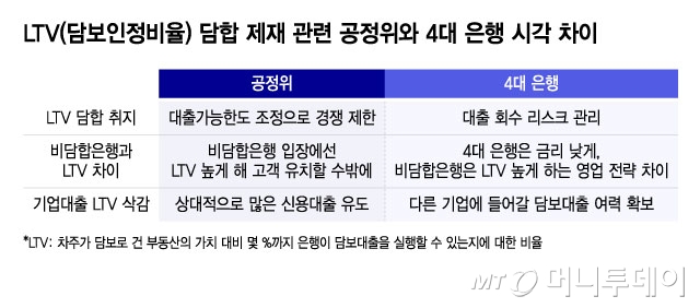 공정위는 LTV를 높이면 대출가능금액이 증가해 더 많은 고객을 유치할 수 있고 LTV를 낮추면 대출금 회수 비용을 줄일 수 있어 4대 은행이 LTV를 담합했다고 봤다. 특히 정부의 별도 LTV 규제가 없는 기업대출 부문에서 정보를 공유해 '경쟁 제한 효과'를 얻었다고 판단한다. 농협·부산·IBK기업 등 은행의 비주택 LTV 평균값이 68.72%인데 반해 4대 은행은 59.92%로 8.8%포인트(P) 낮았다.