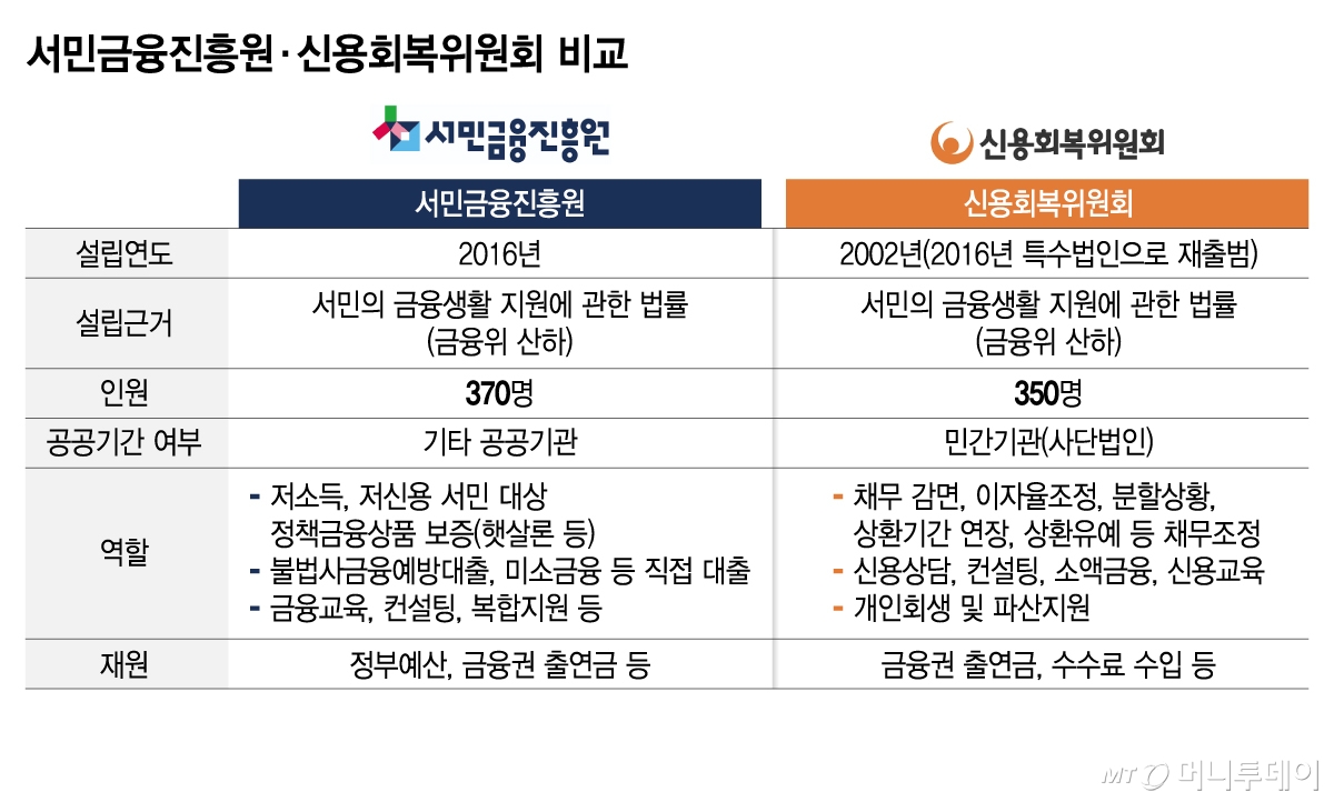 서금원은 정부 기금과 예산, 금융회사 출연금을 재원으로 저소득·저신용자 대상으로 햇살론, 최저신용자 특례보증 등 서민금융상품을 보증해 주는 기관이다. 불법사금융예방대출, 미소금융 등 직접대출도 한다. 지난해 총 공급액은 7조7000억원에 달했다. 신복위는 은행, 2금융권 등 민간 금융회사의 채무에 대해 원금 감면, 이자율 조정, 분할상환, 상환유예 등으로 채무조정을 하는 민간 기구다.