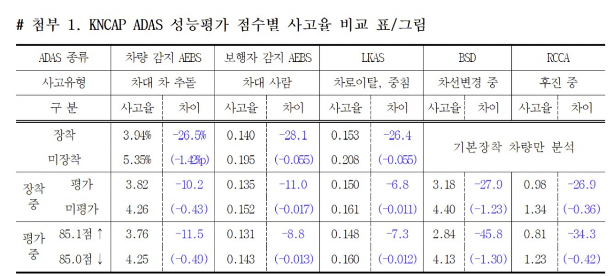 삼성화재 교통안전문화연구소는 KNCAP(한국자동차안전평가) ADAS(첨단운전자지원장치) 성능점수별 사고율 분석 결과, 고성능 장치 장착 차량이 실제 사고율이 모두 낮은 것으로 나타났다고 24일 밝혔다. 사망 및 중상자 발생률도 모두 고성능 장치 차량이 낮았다.