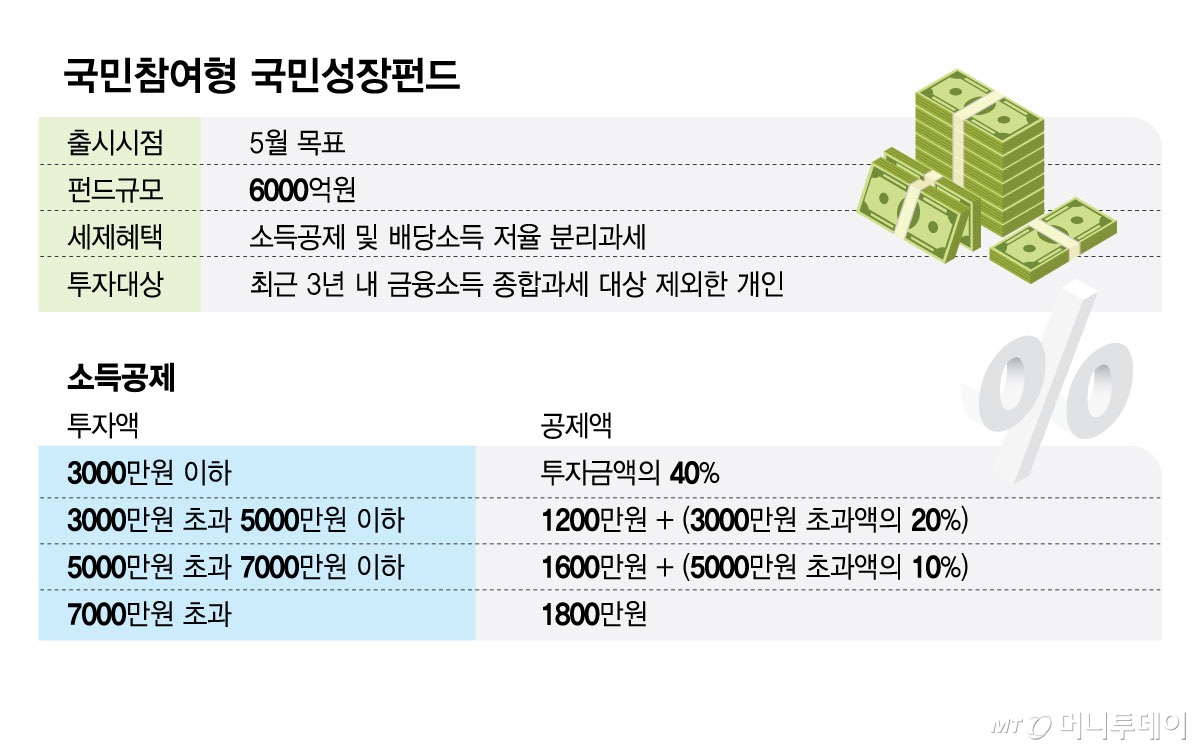 국민참여형 국민성장펀드는 1인당 납입한도를 2억원으로 제한하고 투자 금액 구간에 따라 최대 40%까지 소득공제(최대 1800만원), 배당소득에 대해선 분리과세(9.9%)가 적용이 검토되고 있다.