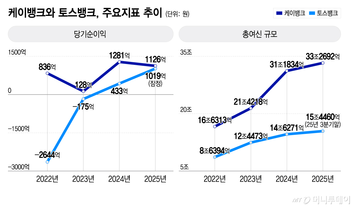 24일 금융권에 따르면 토스뱅크의 지난해 잠정 당기순이익은 1019억원을 기록해 전년(433억원)과 견줘 135% 증가했다. 같은 기간 케이뱅크의 당기순이익은 1281억원에서 12% 줄어든 1126억원으로 집계됐다. 3배 가량 나던 순이익 격차가 불과 100억원대 수준으로 줄었다.