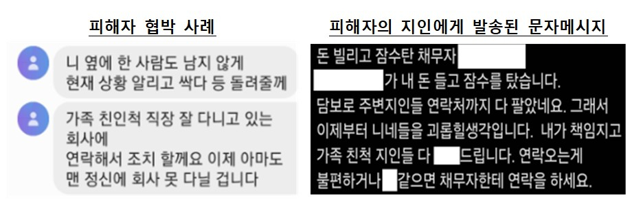 '이 실장' 일당은 피해자의 가족과 지인 등에게 연락해 채무 사실을 유포하고, 협박 및 욕설 메시지 발송했다. 이로 인해 피해자들은 추심 압박에 의한 우울증, 자살충동 등 정신적 고통을 호소하고 있고 실직·이혼·이사 등 정상적인 생활이 불가능한 경우도 있다.
