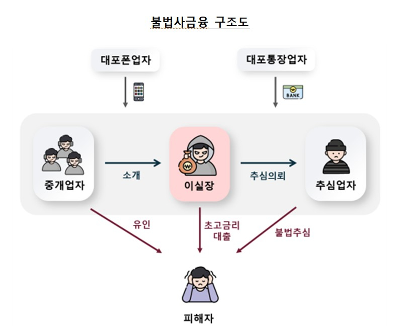 29일 금감원에 따르면 '이 실장' 일당은 대출 중개 사이트, 온라인 커뮤니티 등에서 급전이 필요한 피해자에게 접근 후 '이 실장'(불법사금융업자)에게 연결 후 수수료를 갈취한다. 피해자가 등록 대부업체로 연락하더라도 '통화품질 불량', '신용점수 미달' 등의 사유를 들어 불법사금융업자에게 다시 연락하도록 하는 수법이다.