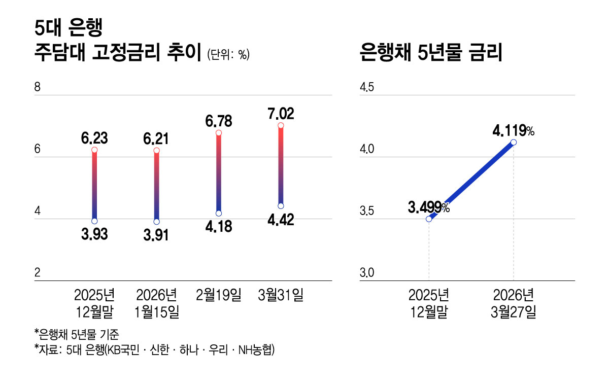 31일 금융권에 따르면 5대은행(KB국민·신한·하나·우리·NH농협)의 혼합형(고정) 주택담보대출(이하 주담대) 금리(은행채 5년물 기준)는 이날 기준 연 4.420~7.020%로 집계됐다. 2022년 10월 이후 처음으로 주담대 고정금리 상단이 7%를 넘은 지난 27일 대비 상·하단 모두 1bp(0.01%포인트) 상승했다. 지난해 12월 말(연 3.930~6.230%)과 비교하면 올들어 상단과 하단이 각 0.790%포인트(P), 0.490%P 올랐다.