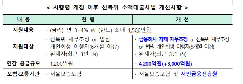이번 시행령 개정을 통해 서금원의 신용보증 대상에 개인이 신복위에 대해 부담하는 금전채무가 추가됐다. 기존 서울보증보험의 보험에 더해 서금원의 신용보증이 제공돼 신복위는 보다 많은 채무조정 이행자에게 저금리 생활안정자금을 지원할 수 있게 됐다. 신복위 소액대출 사업의 연간 공급규모은 종전 1200억원에서 4200억원으로 확대된다.