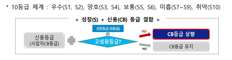 새롭게 도입되는 SCB 모형은 기존 신용등급(CB)과 사업의 미래 성장가능성을 평가하는 성장등급(S등급, Scale-up)을 결합하는 방식이다. 성장등급은 유사한 업종별로 4개 분야로 구분해 10등급 체계로 미래 성장성을 평가한다.