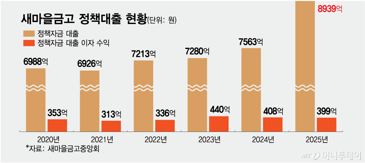 정책자금 대출은 규모를 늘려도 수익을 내기 어렵다. 전국 새마을금고의 공공 및 정책자금 대출 이자 수익은 지난해 398억원에 그친다. 취급 규모가 전년 대비 18% 증가했음에도 이자 수익은 같은 기간 약 10억원 감소했다.