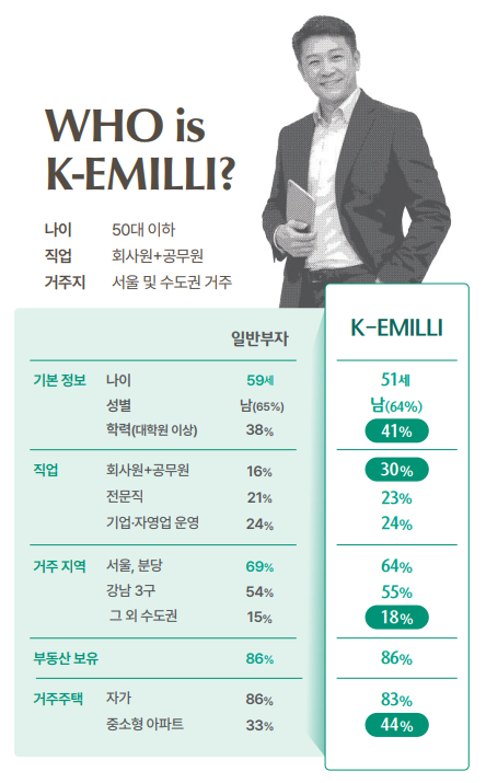 황선경 하나금융연구소 연구위원은 "K-EMILLI는 과거 사업 성공이나 상속에 의존하던 방식에서 벗어나 자신만의 관점으로 적극적인 금융 투자를 통해 부를 축적하고 있는 새로운 부자 유형이다"며 "이들을 중심으로 과거 부 형성의 원동력이었던 부동산 불패 믿음에 균열이 생기고 자산관리의 무게중심이 금융으로 이동한다는 점 또한 주목할 만한 변화"라고 말했다.