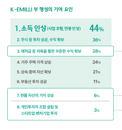 K-EMILLI의 자산 형성 방식은 명확하다. 종잣돈은 예적금 등 저축을 통해 마련하고, 금융투자를 통해 자산을 불리는 구조다. 이들이 응답한 부 형성의 기여 요인의 44%는 소득 상승이었다. 주식 등 투자 성공이 36%, 예적금 등 저축이 28%로 뒤를 이었다. 거주 주택가격 상승 24%, 상속·증여 21%, 부동산 투자 11% 순이었다.
