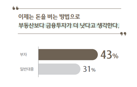 K-EMILLI 뿐만 아니라 전반적으로 부자들은 금융투자로 자산 포트폴리오를 재구축할 의향이 높은 것으로 나타났다. 부자들의 43%가 '이제는 돈 버는 방법으로 부동산보다 금융투자가 더 낫다고 생각한다'고 답한 반면 일반 대중은 31%만이 금융투자가 낫다고 대답했다.