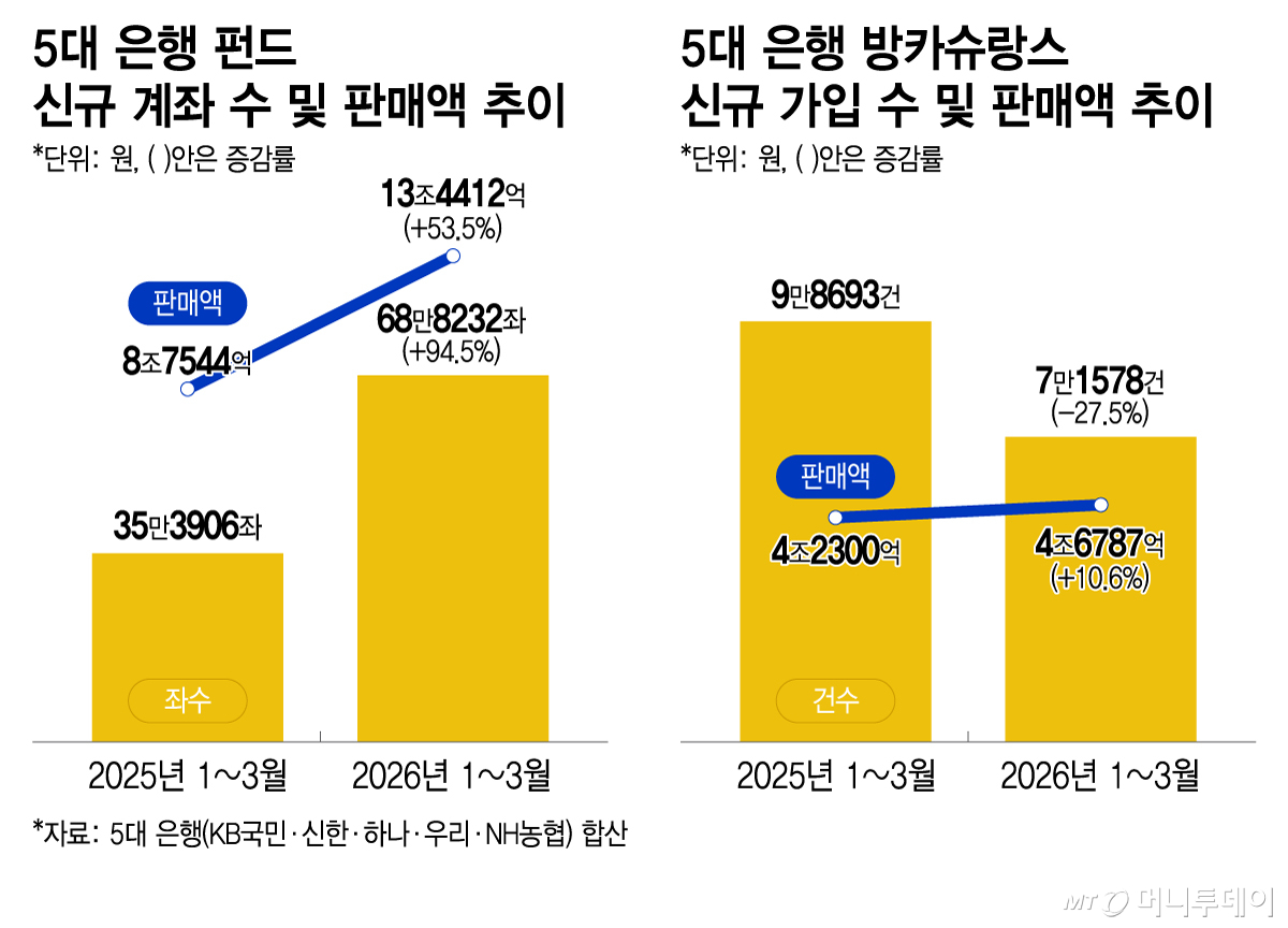 펀드 판매액도 증가했다. 5대 은행의 펀드 판매액은 올해 1분기 13조4412억원으로 지난해 같은 기간(8조7544억원) 대비 약 53% 늘었다. 지난 1월부터 3개월 연속 4조원대 판매액을 기록하며 안정적으로 자금이 유입됐다.