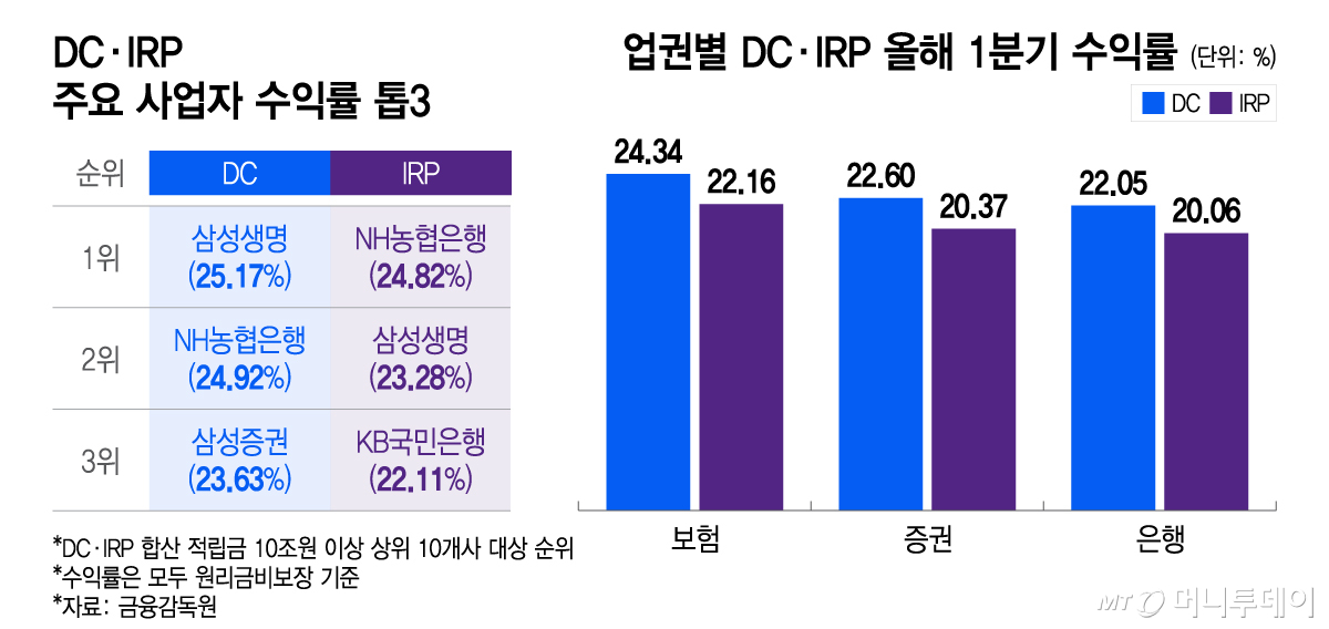 17일 금융감독원 통합연금포털에 따르면 보험업계의 올해 1분기 DC·IRP 퇴직연금 수익률(가중평균)이 지난해 4분기에 이어 은행과 증권업보다 높게 나타났다. 원리금비보장 기준 보험업종의 DC형 1분기 수익률은 24.34%, IRP형 수익률은 22.16%로 은행이나 증권사보다 약 2%포인트(P) 높았다. 삼성생명 등 대형 생보사에 치우쳐 있긴 하지만 2분기 연속 DC·IRP 퇴직연금 수익률이 타업권을 처음 넘어섰다는 점에서 의미가 크다.