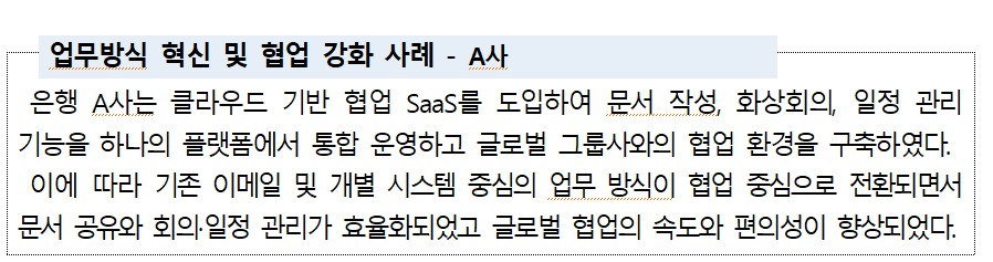 생산성 향상 및 IT 운영 부담은 완화된다. SaaS 활용 시범 운영 및 선도 도입 사례를 분석한 결과 △반복적 수작업 감소 및 업무 자동화 확대 △ 업무처리 시간 단축 및 생산성 향상 △ 시스템 구축·유지 부담 완화 등의 효과가 확인됐다. 또 기업 자체 데이터센터나 사내 서버에 직접 설치하는 방식의 기존 온프레미스(On-Premise) 방식에 비해 필요 자원을 탄력적으로 활용할 수 있어 IT 인프라 운영 부담을 줄이고 비용 효율성도 높일 수 있다.