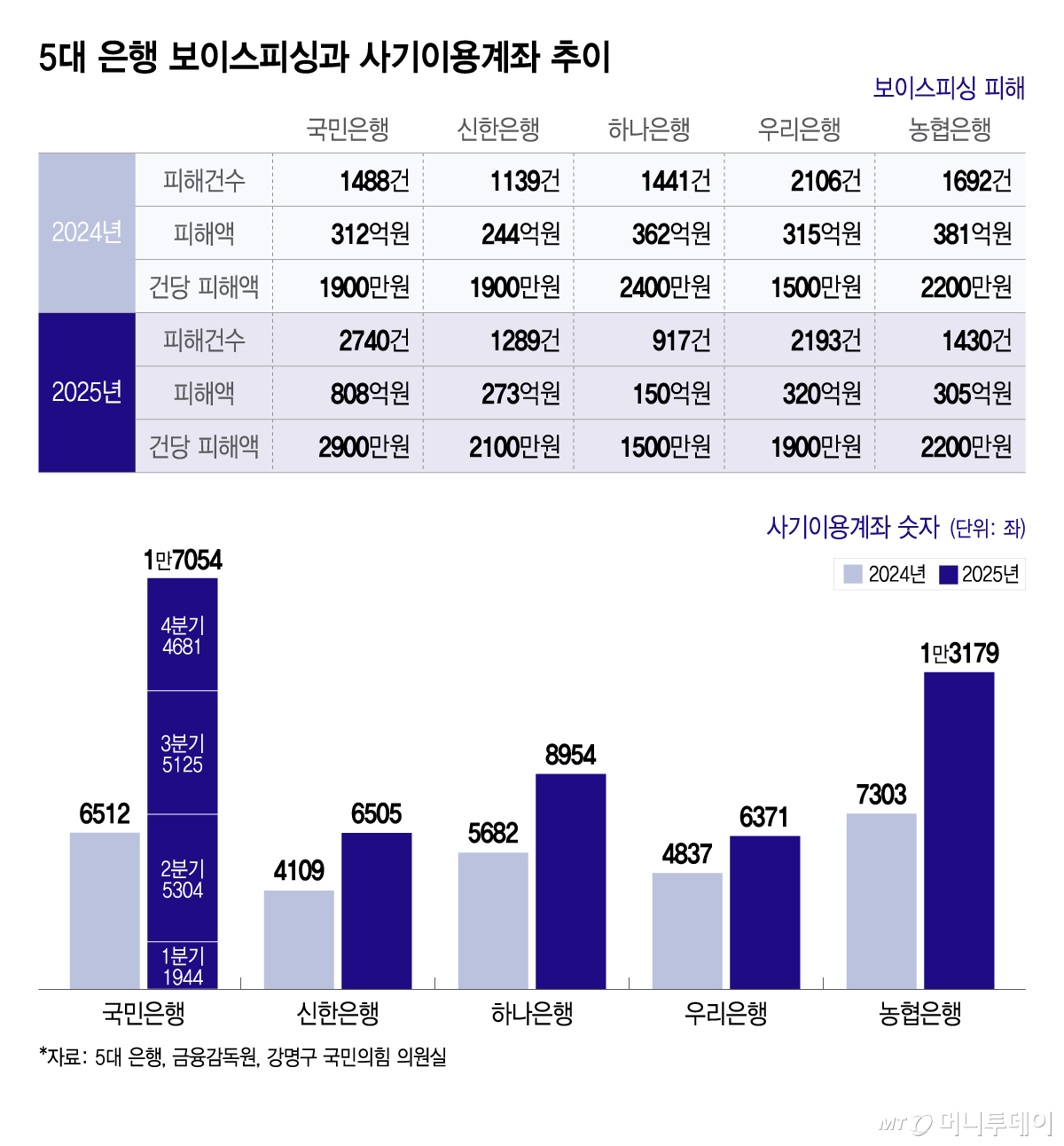 KB국민은행은 빗썸과 제휴 후 보이스피싱이 급증하자 피해 방지를 위한 인력을 대폭 강화했다. 인력을 2배 이상으로 확충하면서 피해 규모는 감소 추세지만 사기이용계좌수는 줄지 않고 있다.