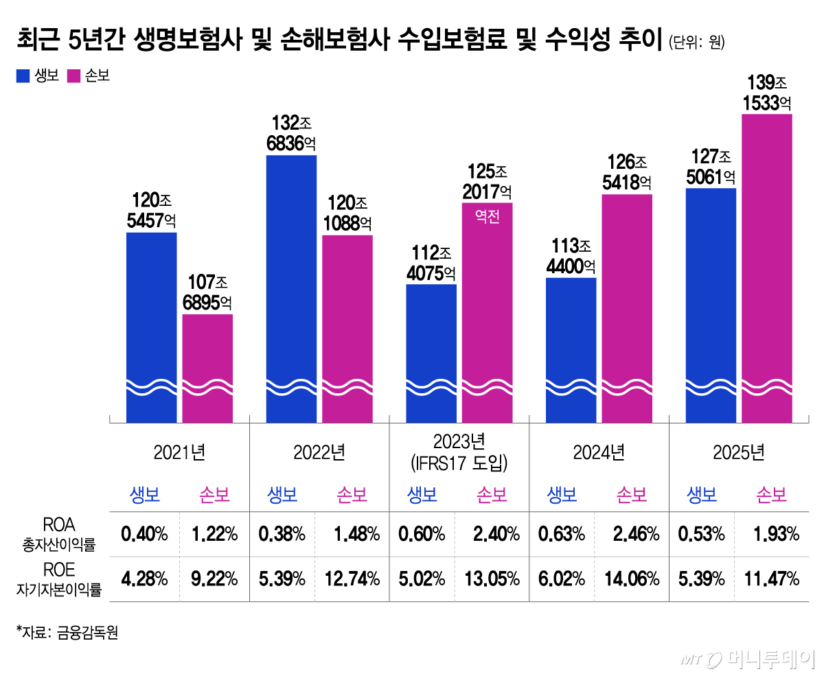 실제 수입보험료를 비롯해 총자산이익률(ROA)이나 자기자본이익률(ROE) 등 수익성지표를 보면 생보사보다 손보사가 월등히 더 높다. 지난해 생보사(22개)의 수입보험료는 127조5061억원, 손보사(30개)의 수입보험료는 139조1533억원으로 나타났다. 2023년을 기점으로 손보업계가 생보업계를 수입보험료 규모에서 처음 역전한 이후 격차가 점점 더 커지는 추세다.