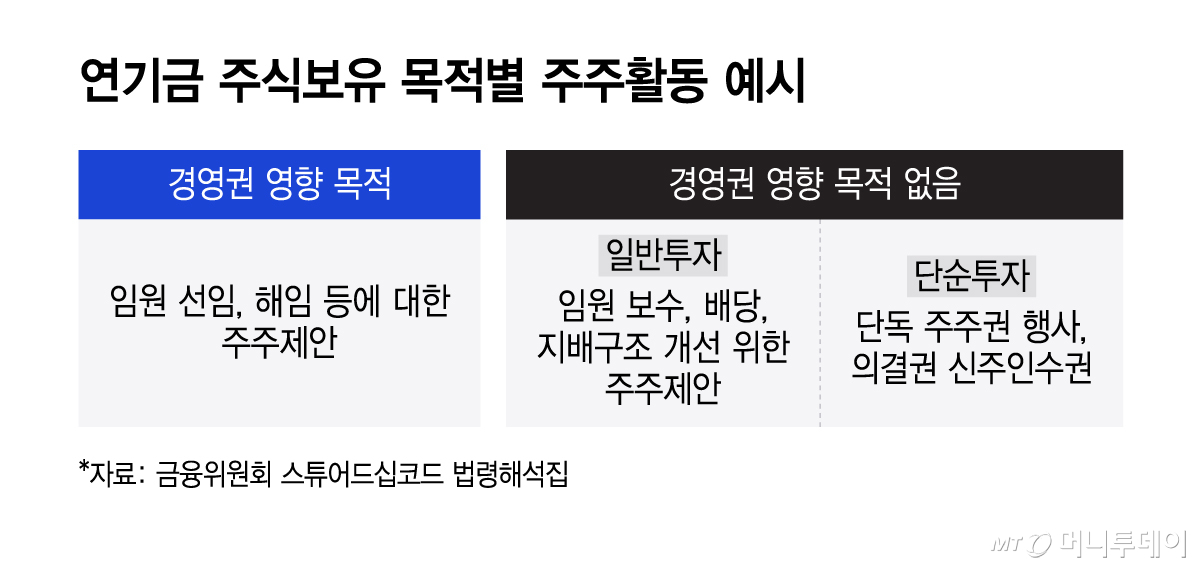 실제 지난 2017년 금융위의 스튜어드십 코드 법령해석집에 따르면 연기금이 지분 5% 이상 보유하더라고 보유목적을 단순투자 혹은 일반투자로 공시한 경우 경영참여 목적으로 보지 않는다. 특히 일반투자 목적이라면 사외이사 추천, 배당 확대 등을 요구하더라고 5%룰에 따른 엄격한 공시 의무, 10%룰에 따른 단기매매차익 환수 대상(국민연금 특례)에 포함되지 않는다는 해석이다.