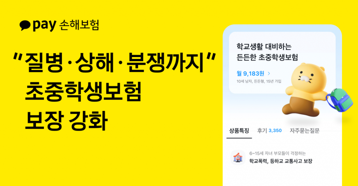 카카오페이손보 관계자는 "초·중학생 시기는 부모의 보호가 닿지 않는 시간과 공간이 빠르게 늘어나는 시기"라며 "학교생활에서 실제로 발생하는 위험과 학부모들의 걱정을 중심으로 꼭 필요한 보장을 강화해, 실질적인 도움이 되는 안전망을 제공하는 데 초점을 맞췄다"라고 말했다.