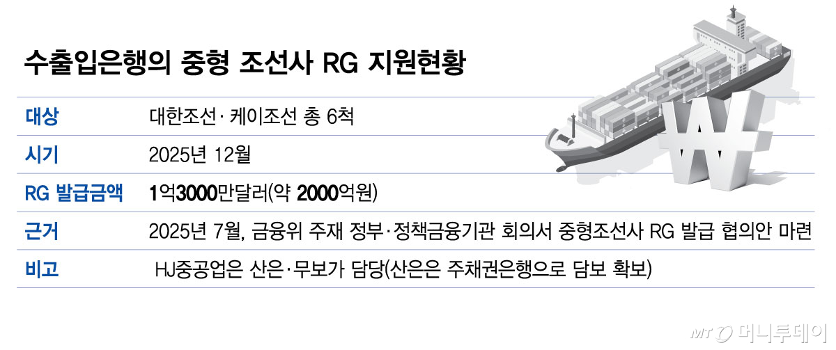수은은 지난해 12월 중형 조선사에 대한 RG 발급을 재개했다. 지난해 7월 금융위 주재 정부·정책금융기관 회의를 통해 중형조선사 RG 발급 협의안에 따라 대한조선·케이조선은 수은과 산업은행이 협의해 지원키로 했다. 이에 따라 수은은 총 6척에 대해 1억3000만달러(약 2000억원) RG를 발행하는 등 정상 지원 중이다.