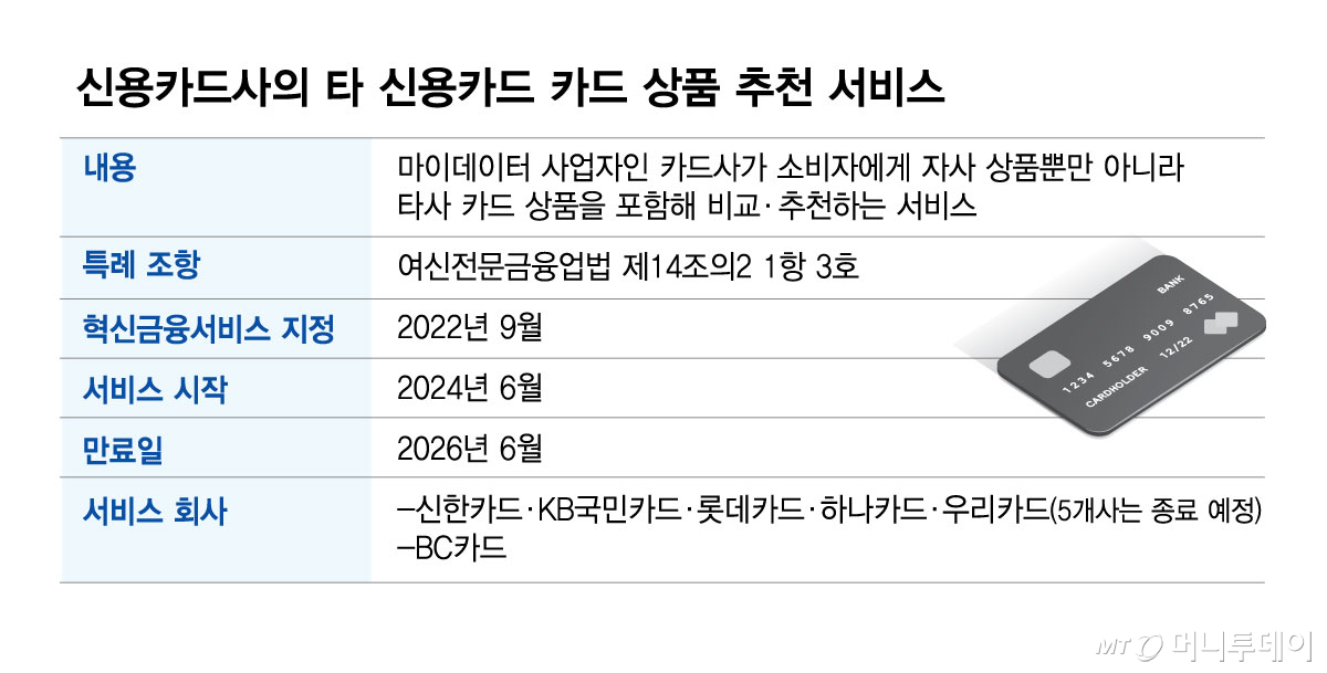 '타 신용카드사 카드상품 추천'은 마이데이터 사업자인 카드사가 자사 앱(애플리케이션)에서 소비자에게 자사상품뿐 아니라 타사의 카드상품도 비교·추천하는 서비스다. 금융위가 2022년 카드상품의 비교선택권을 넓혀 소비자 편익을 증진하자는 취지에서 혁신금융서비스로 지정했다.