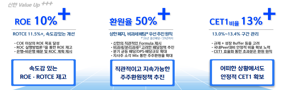 장정훈 신한금융 재무부문 부사장은 이날 컨퍼런스콜을 통해 "주주환원율은 ROE와 성장률에 연동한 예측 가능한 산식을 기반으로 운영할 계획"이라며 "분기 균등배당 기조를 유지하는 가운데 향후 3년간 비과세 배당과 주당배당금(DPS)의 연 10% 이상 확대를 추진하고, 잔여 재원은 자사주 매입·소각에 활용해 주주환원 정책의 일관성과 유연성을 높여 나갈 방침"이라고 말했다.