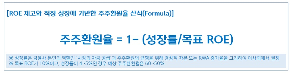성장률은 '시장의 자금 공급'과 주주환원의 균형을 위해 경상적 자본 또는 RWA 증가율을 고려해 이사회에서 결정한다. 주주환원율은 1에서 성장률을 목표 ROE로 나눈 값을 뺀 값으로 결정된다. 일례로 목표 ROE가 10%고, 성장률이 4%인 경우 예상 주주환원율은 60%, 성장률이 5%인 경우는 50%다.