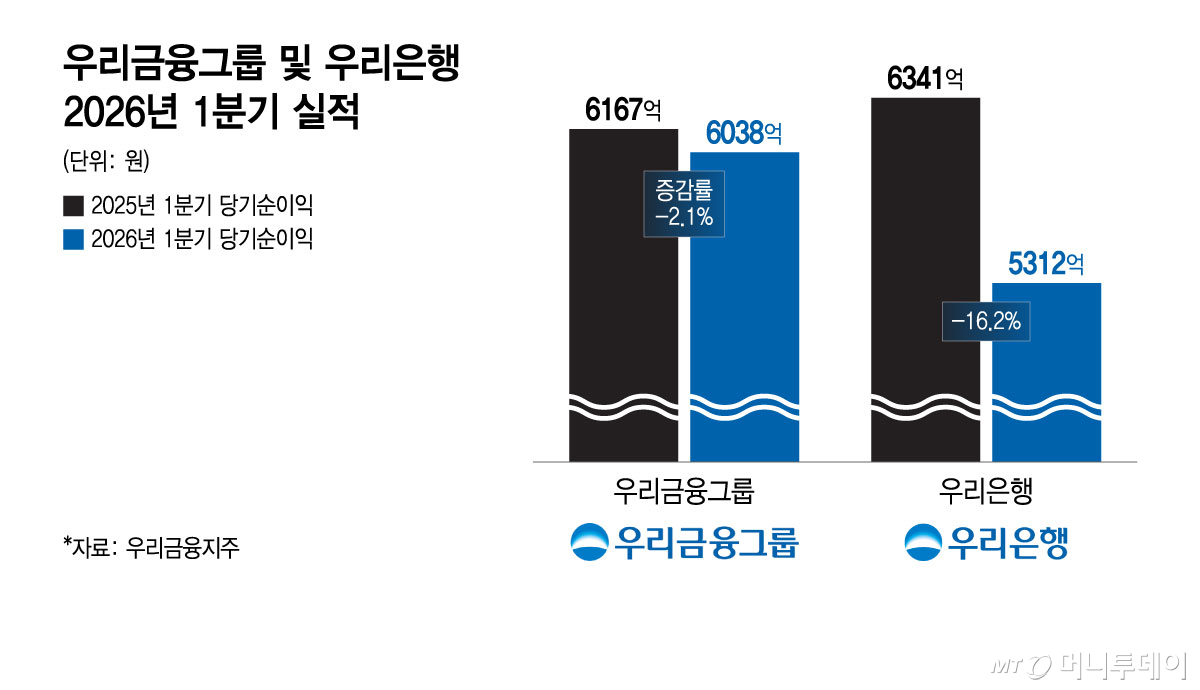 우리금융은 올해 1분기 당기순이익이 6038억원으로, 전년보다 2.1% 감소했다고 24일 밝혔다. 시장 전망치(7760억원)를 크게 밑도는 실적이다. 5대 금융 중 유일하게 역성장을 기록했으며 NH금융(8688억원)보다 밀렸다.