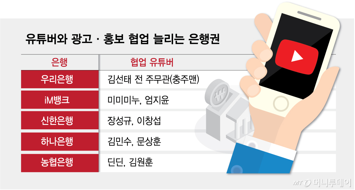 은행권의 홍보 전략이 바뀌고 있다. 배우나 가수 등을 기용해 TV 광고를 중심으로 기업을 소개하던 형태에서 개그맨과 유튜버들을 활용해 콘텐츠를 함께 만드는 방식으로 변하고 있다. '가격 대비 성능'이 좋다는 점과 더불어 특정 세대와 집단에 집중하는 홍보방식이 더 효과적이라는 판단이다.