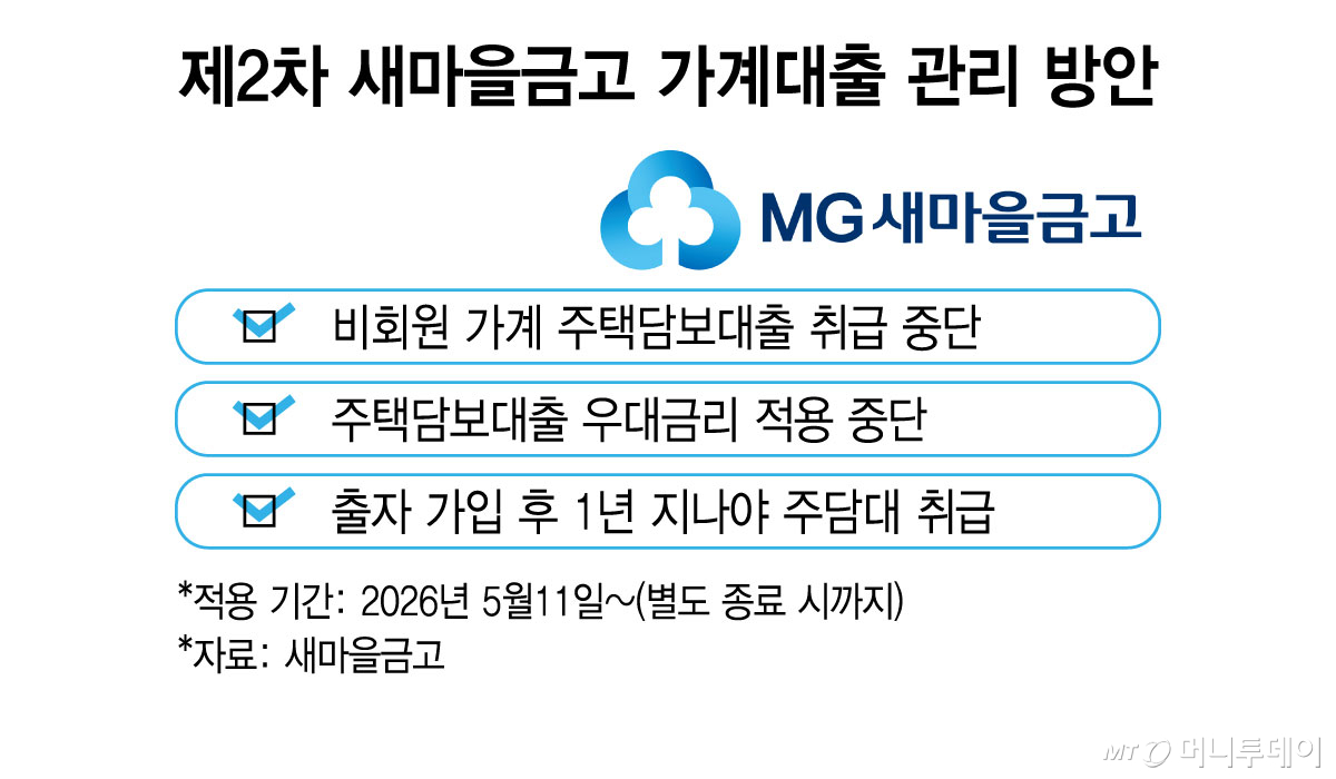 새마을금고 관계자는 "금융당국 조치에 따른 가계대출 총량 관리를 실효성 있게 추진하기 위해 추가 대책을 마련하게 됐다"며 "주담대 중심 가계대출 관리는 철저히 해나가면서도 정책자금 대출 등 서민 금융 공급 기능에는 차질 생기지 않게 할 것"이라고 밝혔다.