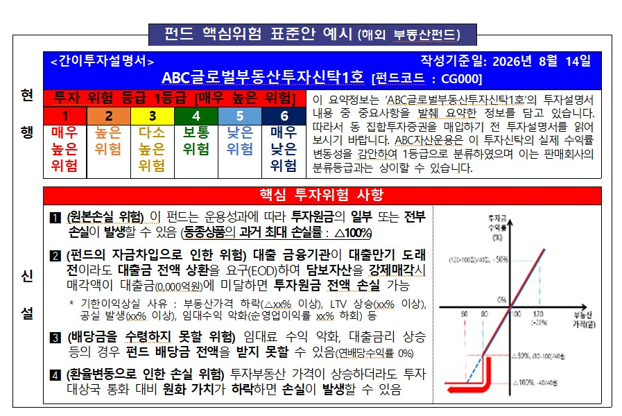 이에 따라 금감원은 소비자에게 부담이 되지 않는 최소 분량으로 핵심 투자위험을 한데 모아 설명하는 '펀드 핵심위험 표준안' 마련할 계획이다. 간이투자설명서 첫 페이지에 원본손실 위험 등 최대 4개의 핵심위험과 동종 상품의 과거 최대 손실률을 기재한다. 업계와 논의를 거쳐 오는 6월 공식 서식을 개정한다.