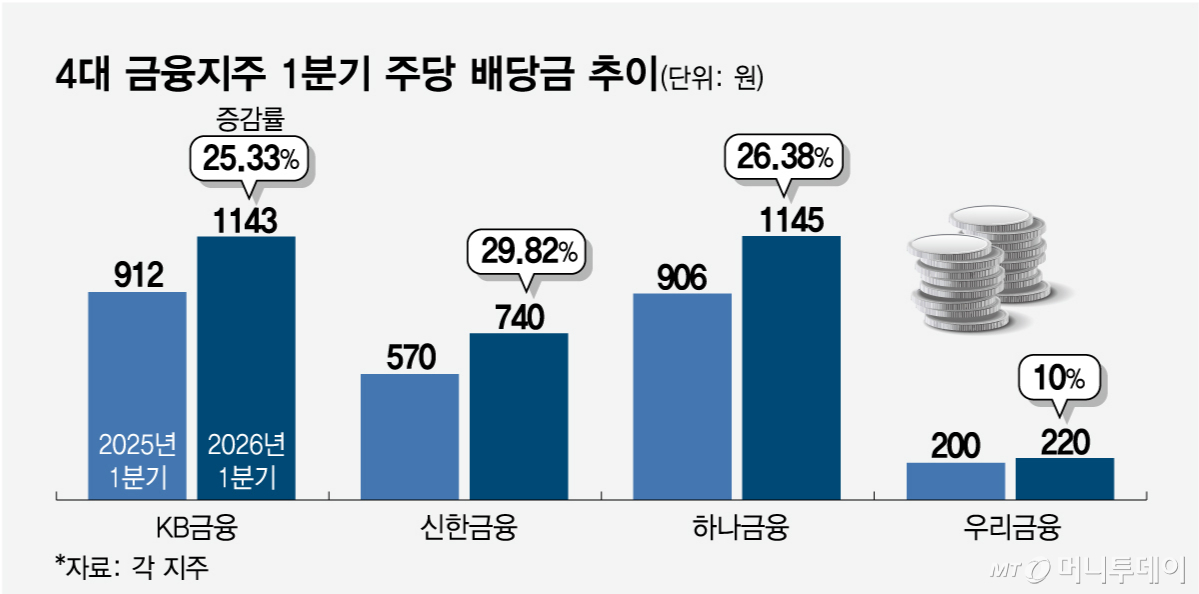 26일 금융권에 따르면 올해 4대 금융 이사회가 결의한 1분기 주당 배당금은 △KB금융 1143원 △신한금융 740원 △하나금융 1145원 △우리금융 220원으로 모두 지난해보다 늘었다.