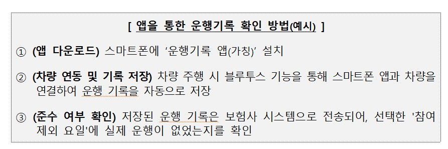 특약의 공정한 운영을 위해 운행기록 검증 절차도 보조적으로 도입된다. 개별 보험사는 운행기록 앱(가칭) 을 개발해 적용하거나 기존 주행거리 특약 정보(예 커넥티드 카) 등을 활용해 5부제 준수 여부를 확인할 계획이다. 차량 5부제 참여 요일 중 운행이 확인되는 경우 특약에 따른 할인 제공이 거절된다.